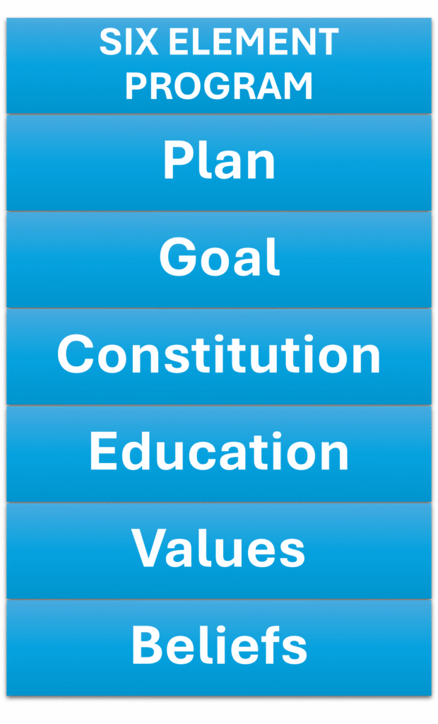 The program has six elements, starting with beliefs and building up to the plan, with the constitution as its central element.